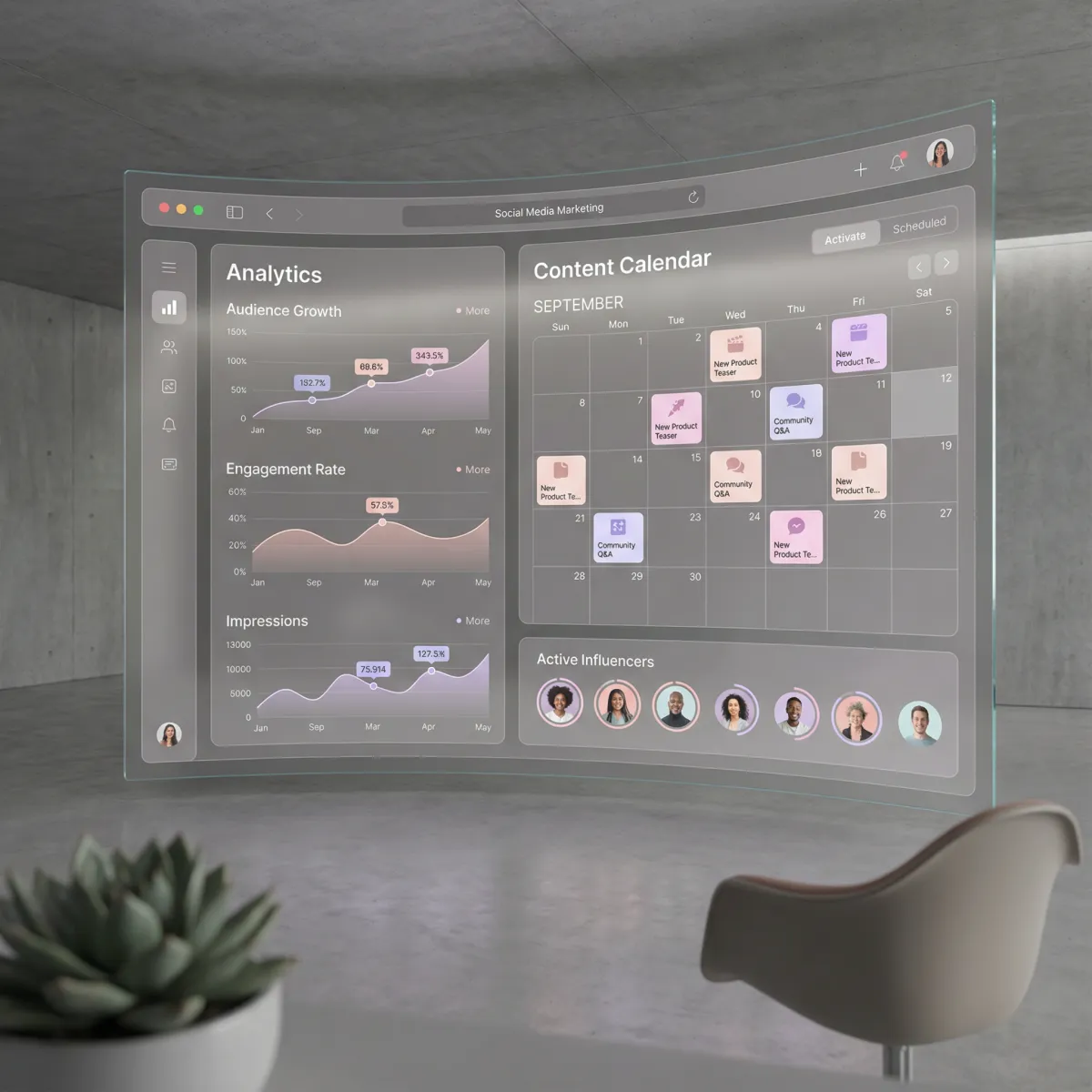 Gestiona redes sociales, contenido, campañas publicitarias y seguimiento comercial.